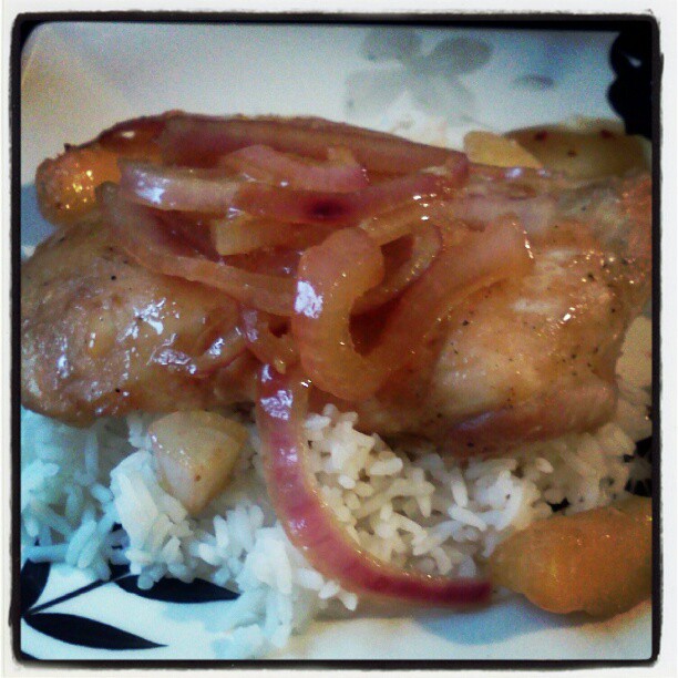 Preheat oven to 450 degrees. Place frozen peaches and onions in a large bowl then add ginger, soy sauce, brown sugar, vegetable oil, sesame oil, and red-pepper flakes, and toss to coat. Pour into a non-stick sprayed 9×13 casserole dish. Nestle marinated chicken into the peaches and onions, and roast until chicken is cooked through, about 25-30 minutes. Serve over cooked rice.